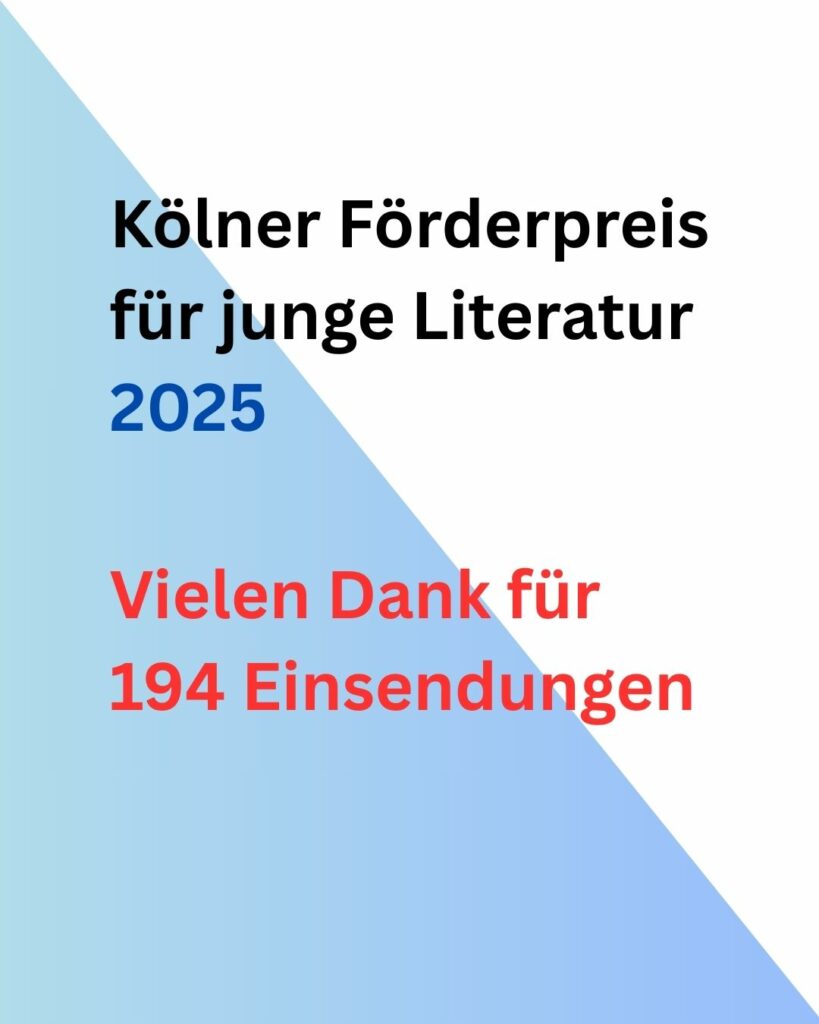 Vielen Dank für 194 Einsendungen zum Kölner Förderpreis für junge Literatur. Die Einsendefrist ist abgelaufen. Daher können wir keine weiteren Einsendungen berücksichtigen.
